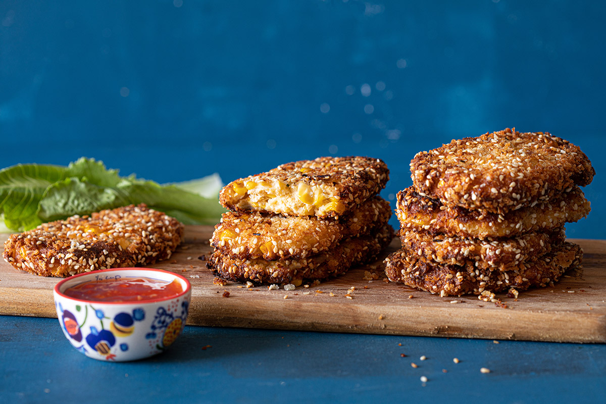שניצל תירס בלי ביצים ועם מרקם רך בזכות הטופו, יהלומים קטנים של תירס מתקתק ופציח שמנקדים את השניצל, ומעטפת זהובה וקראנצ’ית של פירורי לחם עם שומשום.